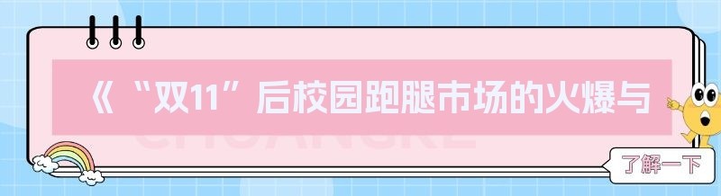 “双11”这个购物狂欢节,不仅让各大电商平台赚得盆满钵满,也给校园里的跑腿生意带来了意想不到的繁荣。在大学校园里,学生们的消费需求日益多样化,而校园跑腿服务正好满足了他们的诸多需求。那么,“双11”过后,校园跑腿生意到底有多火呢?